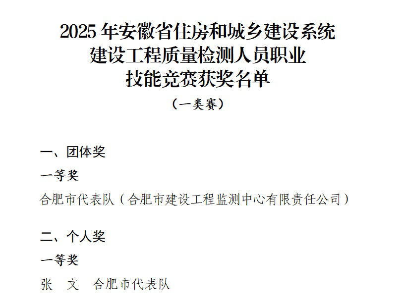 2026年1月5日,安徽省住房和城鄉(xiāng)建設廳公示了2025年安徽省住房和城鄉(xiāng)建設系統(tǒng)建設工程質量檢測人員技能競賽獲獎名單,監(jiān)測中心張文、唐慶康兩位選手組成的合肥代表隊取得了理論成績總分第一、實操成績第一、綜合排名第一的優(yōu)異成績,榮獲團體一等獎;張文選手榮獲個人一等獎! “團體 + 單項”雙豐收的亮眼成績,彰顯了監(jiān)測中心在工程質量檢測領域的過硬實力。